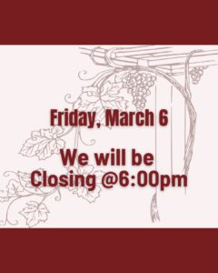 Today we will close at 6:00pm and will resume normal business hours, Saturday, March 7, 2026, 12:00-10:00pm.
